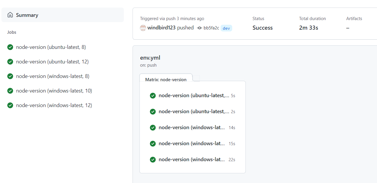 name: Matrix on: push jobs: node-version: strategy: matrix: os: [ubuntu-latest, windows-latest] node_version: [8, 10, 12] exclude: - os: ubuntu-latest node_version: 10 fail-fast: true max-parallel: 1 runs-on: ${{ matrix.os }} steps: - name: Log node version run: node -v - uses: actions/setup-node@v1 with: node-version: ${{ matrix.node_version }} - name: Log node version run: node -v결과
