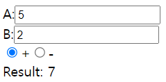 from dash import Dash, html, dcc, Input, Output app = Dash() a_number = dcc.Input(id='input-a', value=0, type='number') b_number = dcc.Input(id='input-b', value=0, type='number') operator_radio = dcc.RadioItems(id='operator-radio', options={'plus': '+', 'minus': '-'}, value='plus') result_text = html.Div(id='output-text', children='Result: 0') app.layout = html.Div([ html.Label('A:'), a_number, html.Br(), html.Label('B:'), b_number, operator_radio, result_text ]) @app.callback( Output('output-text', 'children'), Input('input-a', 'value'), Input('input-b', 'value'), Input('operator-radio', 'value') ) def update_result(a, b, op): result = a + b if (op == 'plus') else a - b return f'Result: {result}' if __name__ == '__main__': app.run_server(debug=True)참고: https://www.udemy.com/course/python-interactive-dashboards-with-plotly-dash