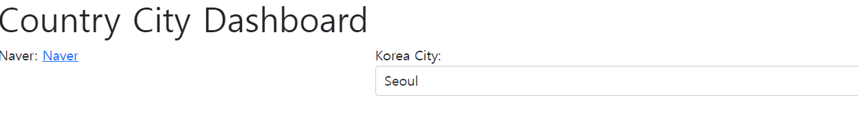 import dash_bootstrap_components as dbc from dash import Dash, html, dcc app = Dash(external_stylesheets=[dbc.themes.BOOTSTRAP]) app.layout = html.Div([ html.H1('Country City Dashboard'), dbc.Row([ dbc.Col( html.P(['Naver: ', html.A('Naver', href='https://www.naver.com', target='_blank')]), width=4 ), dbc.Col( [ html.Label('Korea City: '), dcc.Dropdown( options=['Seoul', 'Pusan', 'Kwangju'], value='Seoul' ) ], width=8 ) ]) ]) if __name__ == '__main__': app.run_server(debug=True)설명