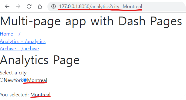 http://127.0.0.1:8050/analytics?city=Montreal 이 동작하는 application 을 개발해 보자