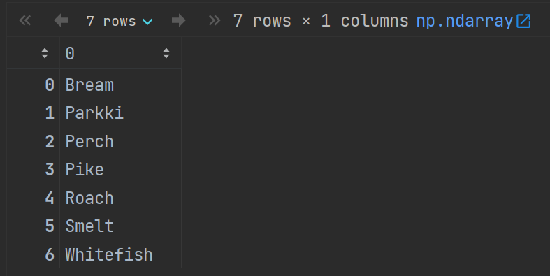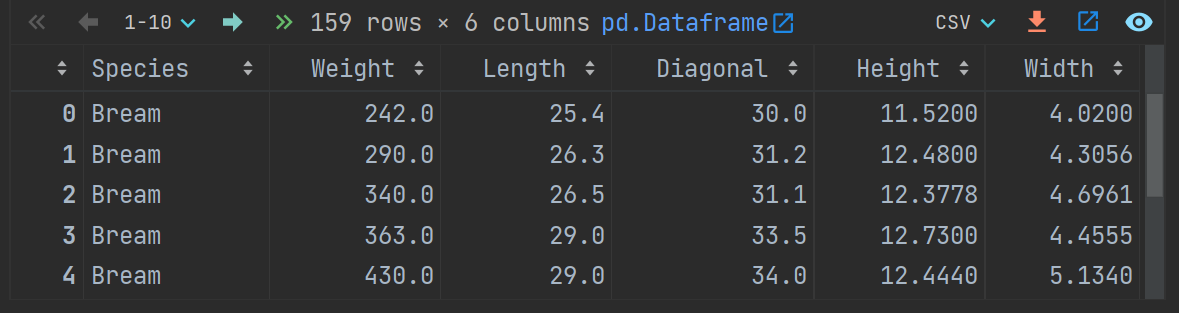 import pandas as pd fish = pd.read_csv('https://bit.ly/fish_csv_data') fish