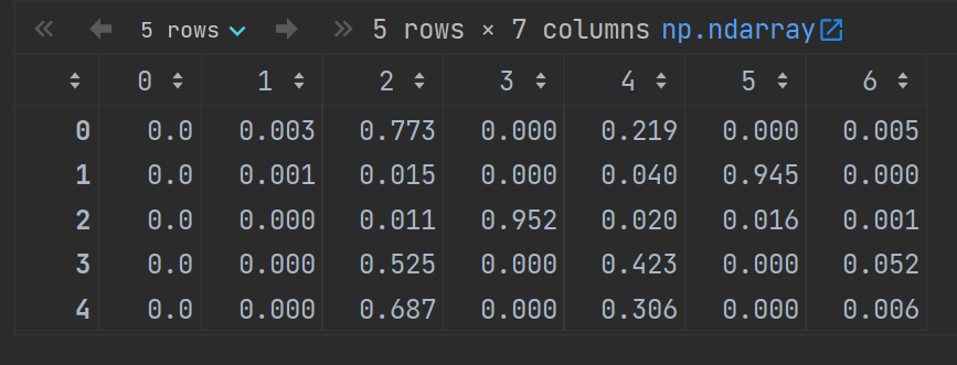 sc.predict(test_scaled[:5]) # Perch Smelt Pike Perch Perch proba = sc.predict_proba(test_scaled[:5]) np.round(proba, decimals=3)