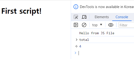 - 위의 예의 경우 브라우저 개발자 도구에서 total 변수 값을 조회해 4 가 나오는 것을 확인해 볼 수도 있다.