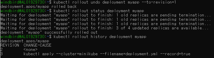 kubectl edit deployment myapp 을 실행해 수정 후 저장하면 변경된 내용이 저장된다. 최초 deploy 이후 변경 history 를 아래 명령어로 확인할 수 있다.