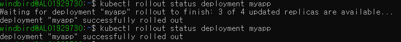혹은 kubectl edit deployment myapp 을 실행하면 myapp deployment editor 가 뜨는데, 여기서 수정 후 저장하면 수정한 부분이 적용된다. deploy 진행 상태를 아래 명령어로 확인할 수 있다.