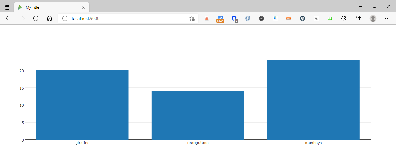 import com.raquo.laminar.api.L._ import org.scalajs.dom import scala.scalajs.js object Main { def main(args: Array[String]): Unit = { val content = div( onMountCallback(ctx => js.Dynamic.global.Plotly.newPlot( ctx.thisNode.ref, js.Array( js.Dictionary( "x" -> js.Array("giraffes", "orangutans", "monkeys"), "y" -> js.Array(20, 14, 23), "type" -> "bar" ) ) ) ) ) val containerNode = dom.document.getElementById("main_content") render(containerNode, content) } }결과