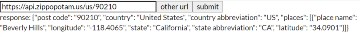 import com.raquo.laminar.api.L._ import org.scalajs.dom import org.scalajs.dom.ext.Ajax import scala.concurrent.ExecutionContext.Implicits.global object Main { def main(args: Array[String]): Unit = { val urlVar = Var("https://api.zippopotam.us/us/90210") val otherButton = button("other url", onClick.mapTo("https://jsonplaceholder.typicode.com/todos/2") --> urlVar) // val (responseOnClick, callback) = EventStream.withCallback[String] // val submitButton = // button("submit", onClick --> (_ => Ajax.get(url = urlVar.now()).map(x => callback(x.responseText)))) val responseOnClick: EventBus[String] = new EventBus val submitButton = button("submit", onClick --> (_ => Ajax.get(url = urlVar.now()).map(x => responseOnClick.emit(x.responseText)))) val content = div( input( typ := "text", width := "300px", controlled(value <-- urlVar.signal, onInput.mapToValue --> urlVar) ), otherButton, submitButton, br(), label("response: "), child.text <-- responseOnClick ) val containerNode = dom.document.getElementById("main_content") render(containerNode, content) } }결과